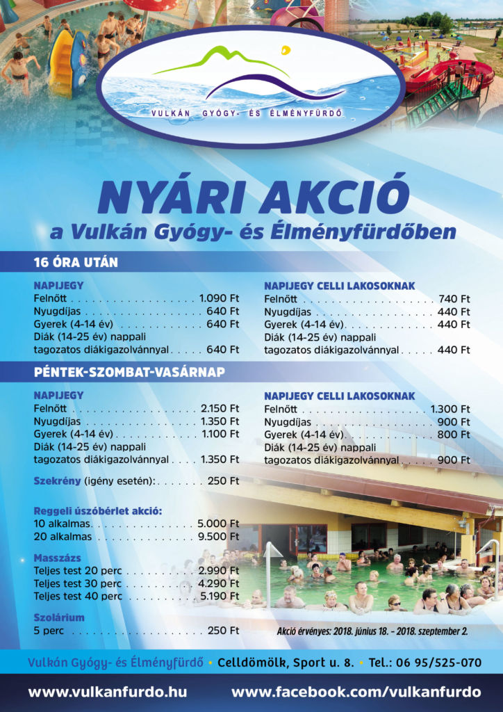 Számszerűsítve ez azt jelenti, hogy egy felnőtt napijegy 2 ezer 150 forintba kerül. A nyugdíjas és a diák 1350 forintba, a gyermek 1100 forintba. A celldömölki lakosok még ennél is olcsóbban fürdőzhetnek. Nekik a felnőtt belépőért 740 forintot, a nyugdíjas, a diák és a gyermek jegyért 440 forintot kell fizetni. De nem csak napi strandbelépők válthatók kedvezményesen a nyáron. Délután négy óra után a felnőtt belépő 1090 forint, a gyermek, a diák és a nyugdíjas pedig 640 forint. Ugyanakkor érdemes ránézni a különféle szolgáltatások áraira is. Azok közül is több kedvezményesen kérhető. Egy 20 perces masszázs például 2 ezer 990 forintba kerül.